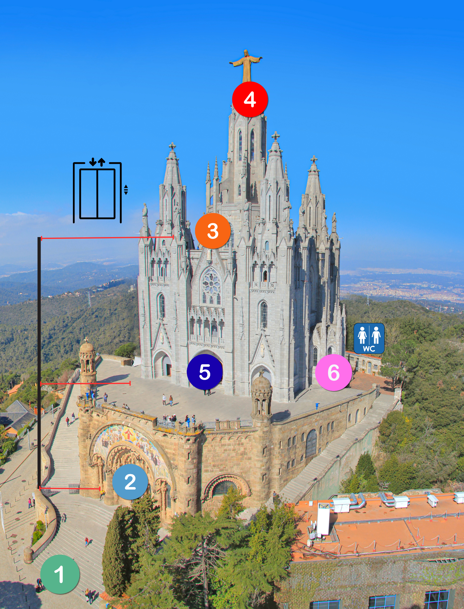 Welcome and welcome to the Expiatory Temple of the Sacred Heart of Jesus. The top of Tibidabo is 504m above sea level. The name of Tibidabo is the union of two Latin words tibi dabo (I will give you) taken from the Gospel according to Matthew where it recounts how Satan in the third temptation to Jesus in the desert said to him: «I will give you all this, if you bow down and adore me». The Jerónimos monks, who had settled in the area of Barcelona called Vall d’Hebrón since 1393, imagined that the devil could have tempted Jesus by offering him from this summit all the riches of the city of Barcelona, and for that reason they decided to call it that way to this mountain. You can see this scene in a stained glass window of the Basilica.